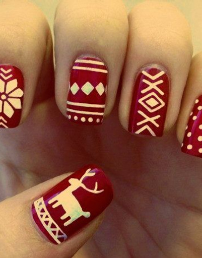 Можно включить фантазию и придумать свой рисунок для каждого ногтя. Здесь возможно все: и северный олень, и снежинка, в центре которой прикреплены стразы, и необычный узор с сердцем, а некоторые ногти накрасить лаком с блестками.