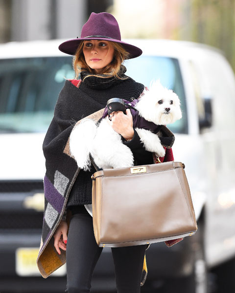 Оливия Палермо нашла способ выглядеть стильно даже в холодный осенний день. Широкополую шляпу благородного фиалкового оттенка она носит в сочетании с объемным пончо BurberryProrsum и узкими черными брюками. Вместительная кожаная сумка песочного цвета – идеальный завершающий штрих образа.
