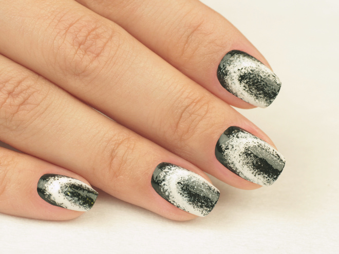 С помощью губки и лака черного цвета сделайте дымку в центре ногтя. Наберите на губку небольшое количество лака и промокните на ноготь. При нанесении не нажимайте слишком сильно на спонж, иначе он может впитать всю краску.http://womans-beauty-health.blogspot.com/